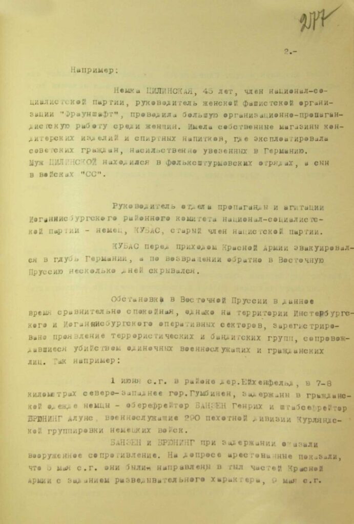 В частности, зафиксирован инцидент в посёлке Мазурин-Зиглунд, где военнослужащий застрелил подростка-немца, «который изъявил желание работать у русских». В посёлке Прейловен группа поляков в гражданской одежде напала на дом, избила женщину, забрала двух лошадей и сбежала.