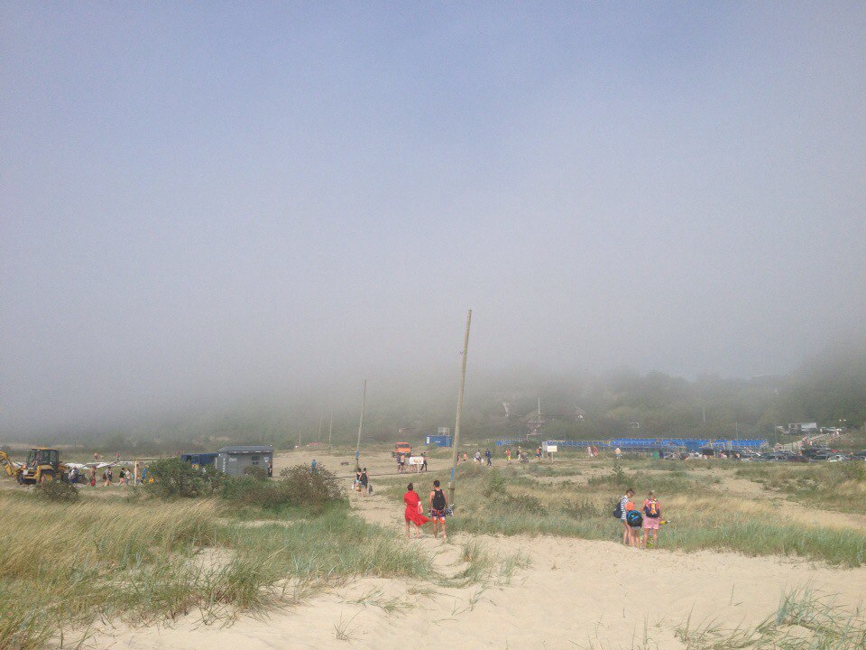 Сегодня в связи с хорошей погодой пляж в поселке практически забит. Как сообщает наш корреспондент Яна Щербатая, на побережье резко поднялся ураганный ветер, появился густой туман, жара сменилась холодом, не стало видно воды. В данный момент отдыхающие покидают пляж.